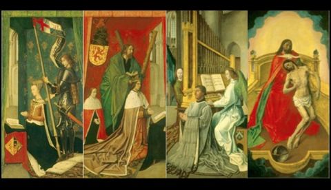 The second image I have for you today is actually the one remaining extent image of the Trinity that is to be found in Scotland. This is the Trinity Altarpiece, and it’s currently at the National Gallery of Scotland, but it’s also, I think, it was part of a college chapel in Edinburgh, originally. And in it, you have this vision of God as Trinity, and then you have these other figures from Scottish history. And let me see if I could walk you through it, so you can see just how profound the message of this panel painting is.