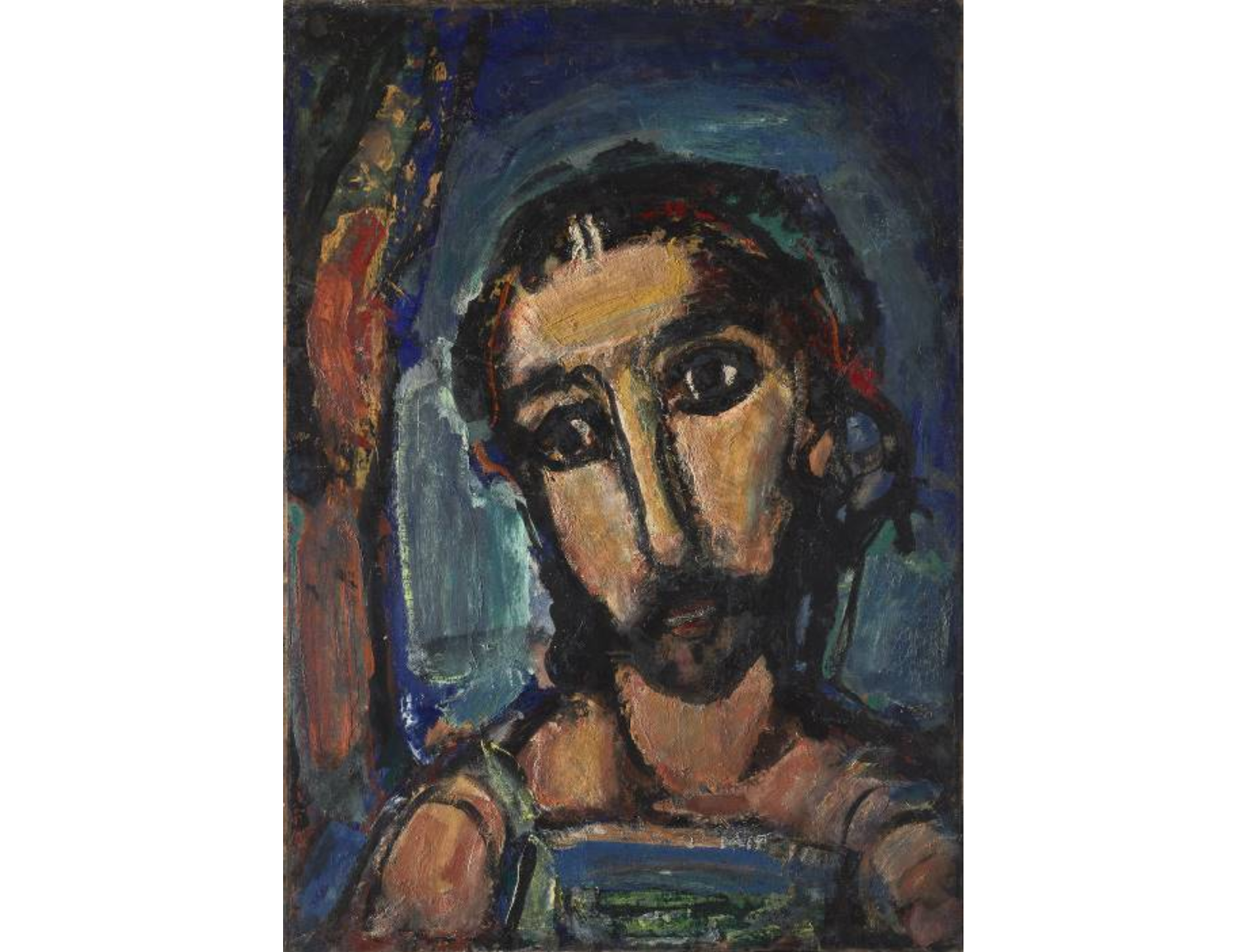So the painting of Jesus that he has with us today, it looks a little bit like you might see it in stained glass, because he has these dark thick lines. And you would almost see in the face of Christ some of the features of an icon, because the nose is really long. And if you notice on many icons, the nose is always incredibly long. But ultimately what Rouault wants us to see in this painting is that Jesus who is immersed in everyday life, looking out, hoping to meet our gaze.