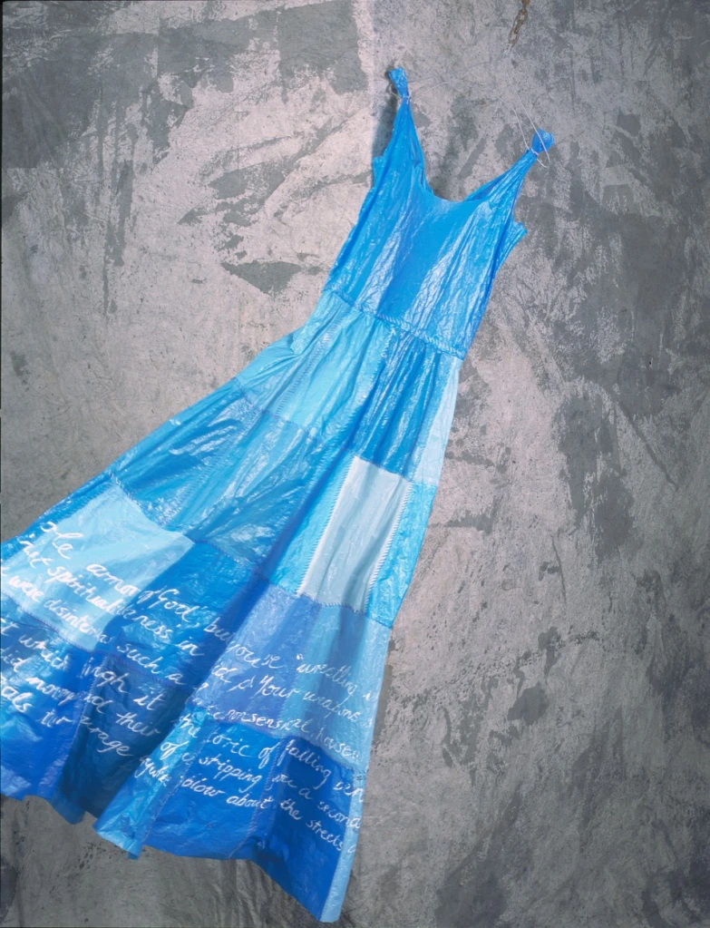 “Sister, a plastic bag may not be the whole armor of God, but you were wrestling with flesh and blood, and against powers, against the rulers of darkness, against spiritual wickedness in sordid places. Your weapons were your silence and a piece of rubbish. Finding that bag and wearing it until you were disinterred is such a frugal, common-sensical, house-wifely thing to do, an ordinary act… At some level you shamed your capturers, and they did not compound their abuse of you by stripping you a second time. Yet they killed you. We only know your story because a sniggering man remembered how brave you were. Memorials to your courage are everywhere; they blow about in the streets and drift on the tide and cling to thorn bushes. This dress is made from some of them. Hamba kahle. Umkhonto – ” which is Xhosa for “go well, warrior.”