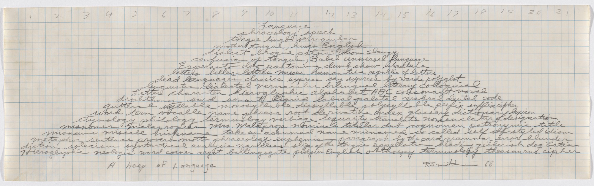 In your bulletin cover today, I have one way of ways in which people have tried to identify the problem of language. In 1966, Robert Smithson, who was better known as a land artist and made this beautiful spiraling kind of jetty. He drew this quick sketch called a heap of language. And it’s there that he listed all the ways we try to express ourselves. And the problem for Smithson is that language has to be a kind of bridge between non-existence and existence. Do I exist? Do the words I use matter on an eternal plane? For Smithson, the concern, the fear is all the language we use is just a kind of mount of babble that heaps up upon itself.