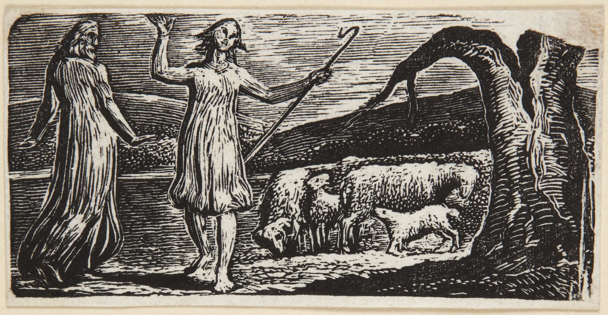 I have a piece of art for you today that’s on your bulletin that captures this difference in hearing, and it’s by William Blake, the incredible poet and painter from the 19th century. And Blake took up woodcutting when he was 64 years old, and this is one of his first woodcuts that he did. And it was done for a publication that was trying to somehow work out a kind of representation of Dante’s divine comedy in the context of the English countryside. And I won’t take you into that too much. But it’s an incredibly beautiful woodcut because you have these two figures, Thenot, who is the representative of Virgil, who is going to bring this friend to God, and Colinet, who is a younger person who needs guidance.